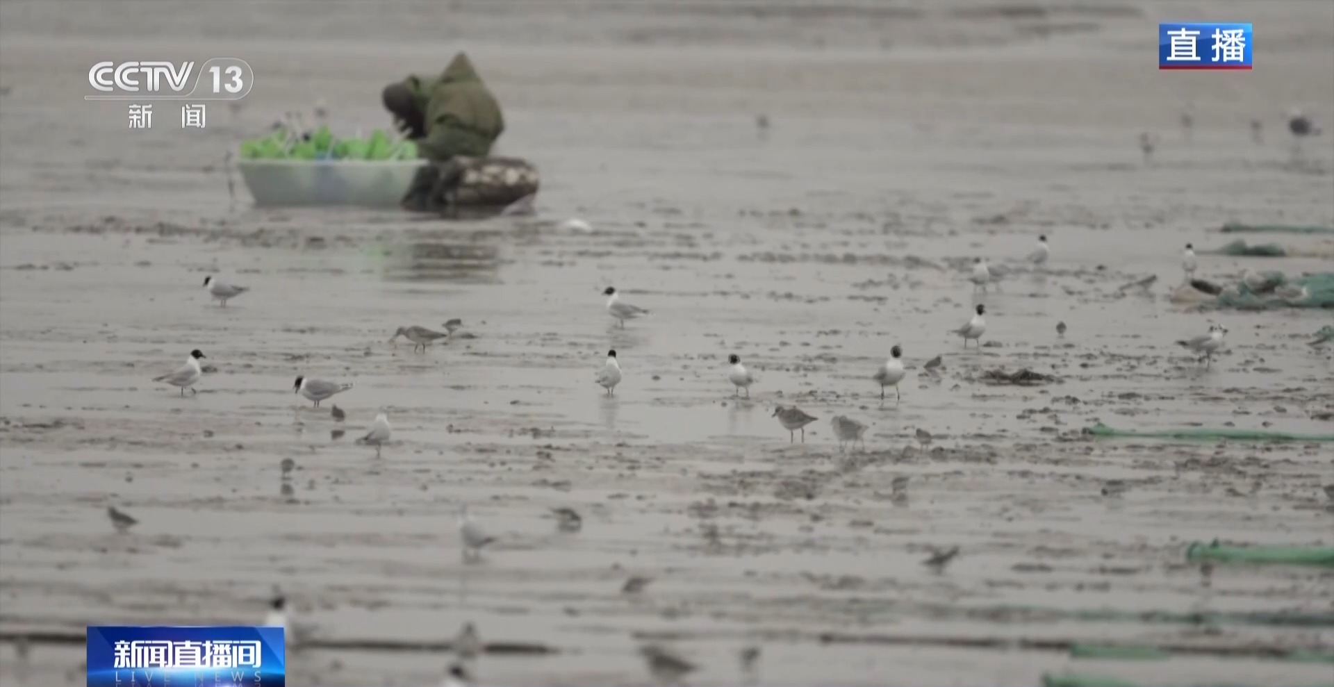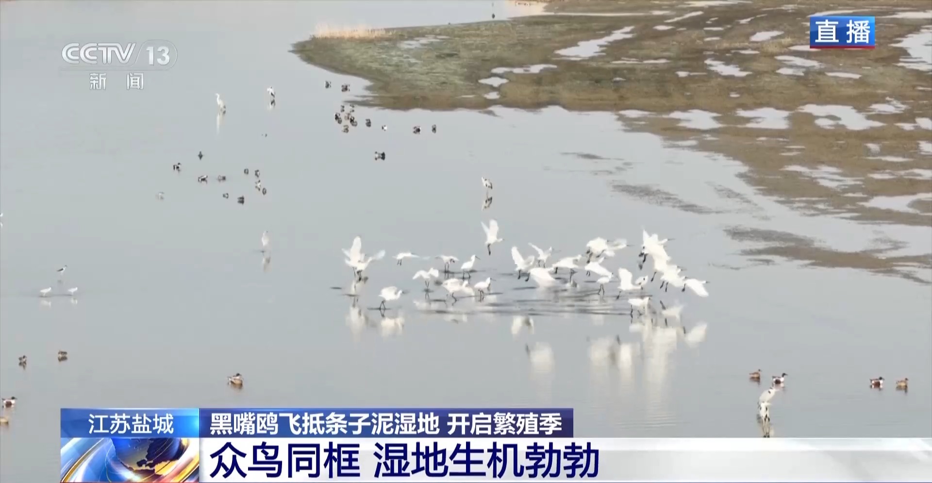 总台记者 徐大为:这段时间,北迁的候鸟已经陆续抵达条子泥湿地,种类和数量都相当可观。条子泥湿地面积很大,除了集中观鸟点,沿着海堤公路,都能看到各种鸟。这两天我们直播团队蹲守,拍到了几十种鸟,还很容易拍到几种鸟同框,比如,白琵鹭、黑脸琵鹭、反嘴鹬、苍鹭、琵嘴鸭。